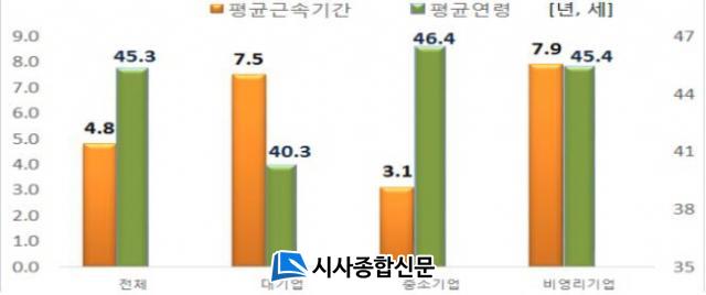 Áö³ÇØ 12¿ù Åë°èûÀÌ ºÐ¼®ÇÑ ¡®2018³â ÀÏÀÚ¸®ÇàÁ¤Åë°è¡¯ °á°ú¿¡ µû¸£¸é Àüü ÀÏÀÚ¸®ÀÇ Æò±Õ ±Ù¼Ó±â°£Àº 4.8³â, 5³â ÀÌ»ó ±Ù¼Ó ºñÁßÀº 26.6%·Î Áý°èµÆ´Ù. ±â¾÷±Ô¸ðº° ±Ù·ÎÀÚÀÇ Æò±Õ ±Ù¼Ó±â°£Àº ´ë±â¾÷ 7.5³â, Áß¼Ò±â¾÷ 3.1³â, ºñ¿µ¸®±â¾÷ 7.9³âÀ¸·Î ³ªÅ¸³µÀ¸¸ç Æò±Õ ¿¬·ÉÀº ´ë±â¾÷ 40.3¼¼, Áß¼Ò±â¾÷ 46.4¼¼, ºñ¿µ¸®±â¾÷ 45.4¼¼·Î Á¶»çµÆ´Ù.