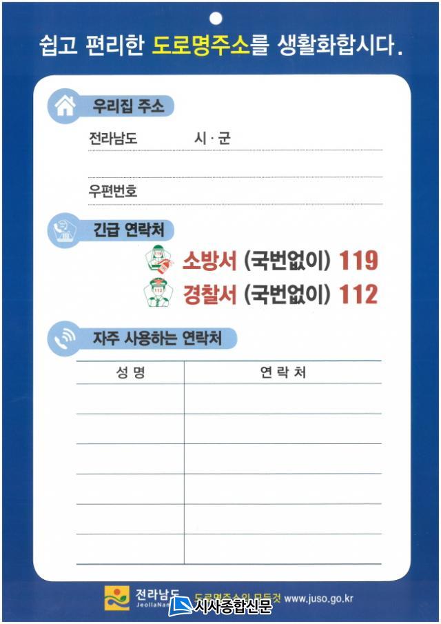 ¾È³»Ç¥Áö¿¡´Â ¿ì¸® Áý µµ·Î¸íÁÖ¼Ò, ±ä±Þ ÀüȹøÈ£(112, 119)¿Í ÇÔ²² °¡Á· µîÀÇ ÀüȹøÈ£¸¦ ÇÔ²² ¾µ ¼ö ÀÖµµ·Ï ÇßÀ¸¸ç, Áö¿ª ³» µ¶°Å³ëÀÎ 1,000¸í¿¡°Ô ³ëÀε¹º½ »ýȰÁö¿ø»ç°¡ Á÷Á¢ °¡Á¤À» ¹æ¹®ÇØ µµ·Î¸íÁÖ¼Ò¿¡ ´ëÇØ ¼³¸íÇϰí À§±ÞÇÑ »óȲ¿¡¼ Á¤È®ÇÑ ÁÖ¼Ò¸¦ ¹àÈú ¼ö ÀÖµµ·Ï Çß´Ù.