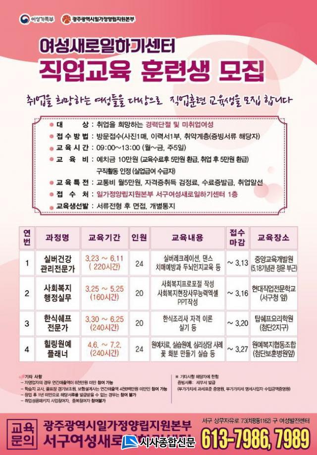 ¿ÃÇØ Á÷¾÷±³À°ÈÆ·ÃÀº °ü³» ±¸ÀÎ ±â¾÷ü ¼ö¿äÁ¶»ç¿Í °æ·Â´ÜÀý ¿©¼ºµéÀÇ Æ¯¼ºÀ» °í·ÁÇØ ÀçÃë¾÷ ¼±È£µµ°¡ ³ôÀº Á÷Á¾À» ¹Ý¿µÇß´Ù. »çȸº¹ÁöÇàÁ¤ ½Ç¹«, ½Ç¹ö°Ç°°ü¸® Àü¹®°¡, ÇѽĽ¦ÇÁ Àü¹®°¡, Èú¸µ¿ø¿¹ Ç÷¡³Ê µî 4°³ °úÁ¤À¸·Î, ±¤ÁÖ½Ã¿Í ¿©¼º°¡Á·ºÎ ½É»ç¸¦ °ÅÃÄ ÃÖÁ¾ ¼±Á¤Çß´Ù.