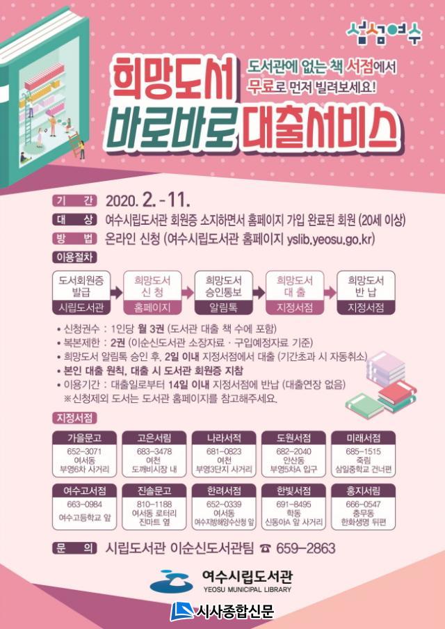 ÀÐ°í ½ÍÀº Ã¥ÀÌ À̼ø½Åµµ¼°ü¿¡ ¾ø´Â °æ¿ì ¿©¼ö½Ã¸³µµ¼°ü ȨÆäÀÌÁö(yslib.yeosu.go.kr)¿¡ Á¢¼ÓÇÏ¿© Èñ¸Áµµ¼¸¦ ½ÅûÇϸé ÁöÁ¤ÇÑ ¼Á¡¿¡¼ ¹Ù·Î Ã¥À» ºô·Áº¼ ¼ö ÀÖ´Ù.