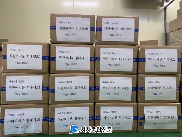 [½Ã»çÁ¾ÇսŹ® = ¿À½ÂÅà ±âÀÚ] ½Å¾È±º(±º¼ö ¹Ú¿ì·®)Àº Áö³ 3¿ù 2ÀÏ Àڸŵµ½ÃÀÎ °æ»ê½Ã(½ÃÀå ÃÖ¿µÁ¶)¿¡ Äڷγª19 È®»ê¹æÁö¸¦ À§ÇØ ÃÑ·ÂÀ» ±â¿ïÀ̰í ÀÖ´Â Á÷¿øµéÀ» °Ý·ÁÇϱâ À§ÇØ ½Å¾È±º Ư»êǰÀÎ Èæ¸¶´Ã Áø¾× 2,100Æ÷¿Í Á¶¹Ì±è 2,400°³¸¦ Áö¿øÇß´Ù°í ¹àÇû´Ù.