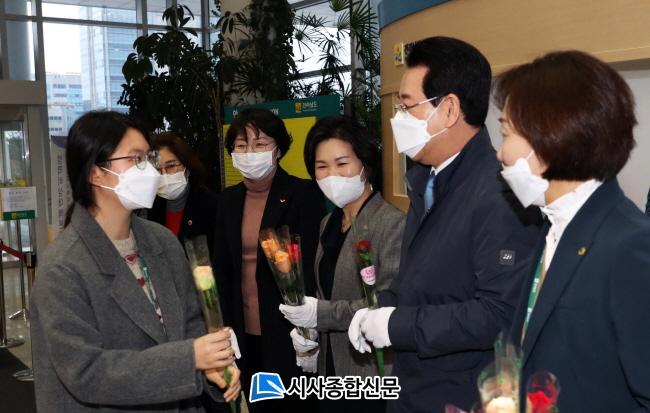 µµÃ»¿¡¼ ¸¶·ÃµÈ À̳¯ Çà»ç´Â Ãâ±ÙÇÑ Á÷¿øµé¿¡°Ô Àå¹Ì²É°ú ¶±À» ÁõÁ¤ÇÏ°í ¿©¼ºÆø·Â OUT, ¼ºÆòµîÇÑ Á÷Àå¹®È Á¶¼º µî ½½·Î°ÇÀ» ¿ÜÄ¡¸ç ¿©¼ºÀÇ ³¯ Àǹ̸¦ µÇ»õ±ä ½Ã°£ÀÌ µÆ´Ù.