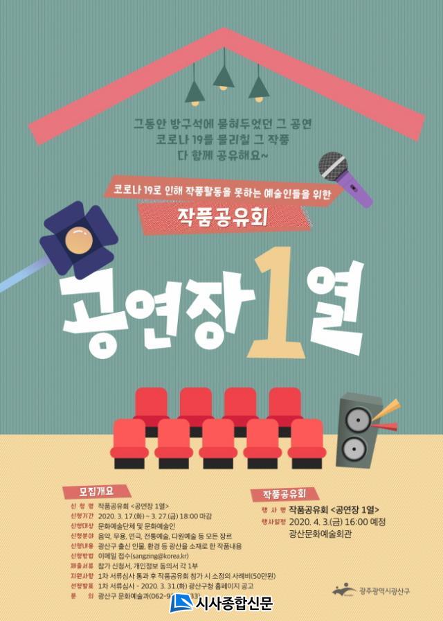 ±¤»ê±¸(±¸Ã»Àå ±è»ïÈ£)°¡ Äڷγª19·Î °ø¿¬ Ȱµ¿ÀÌ Áß´ÜµÈ ¿¹¼úÀεéÀ» ÀÀ¿øÇÏ´Â ÀÛǰ(±âȹ) °øÀ¯È¸ ¡®°ø¿¬Àå1¿¡¯ Çà»ç¸¦ ´ÙÀ½´Þ 3ÀÏ ±¤»ê¹®¿¹È¸°ü¿¡¼ °³ÃÖÇϱâ·Î Çϰí, ÀÌ´Þ 27ÀϱîÁö Âü¿© ¿¹¼úÀΡ¤´Üü¸¦ ¸ðÁýÇÑ´Ù.