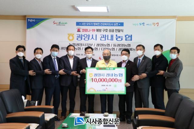 À̹ø¿¡ Àü´ÞµÈ ¼º±ÝÀº °ü³»¿¡ À§Ä¡ÇÑ ³óÇù±¤¾ç½ÃÁöºÎ, ±¤¾ç³óÇù, µ¿±¤¾ç³óÇù, ±¤¾çµ¿ºÎ³óÇù, Áø»ó³óÇù, ´Ù¾Ð³óÇù, ±¤¾ç¿ø¿¹³óÇù¿¡¼ ±¤¾ç½Ã¹ÎÀÇ Äڷγª19 °¨¿° È®»ê¹æÁö ¹× ±Øº¹À» À§ÇØ ¼º±Ý 1,000¸¸¿øÀ» ±âŹÇÏ¿´´Ù.