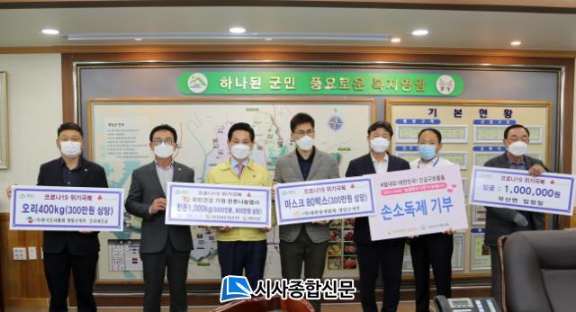 Áö³ 3¿ù 27ÀÏ ´ëÇѾç°èÇùȸ ¿µ¾Ï±ºÁöºÎ(ÁöºÎÀå ÃÖ¿µÁø) ¸¶½ºÅ© 80¹Ú½º(3¹é¸¸¿ø »ó´ç), Çѱ¹¿À¸®Çùȸ ¿µ¾Ï±ºÁöºÎ(ÁöºÎÀå ¾ç»óÇö) ¿À¸®°í±â 5kg 80¹Ú½º(3¹é¸¸¿ø »ó´ç), ´ëÇÑ¿À¸®Çùȸ ¿µ¾Ï±ºÁöºÎ(ÁöºÎÀå ÀÓ¼ºÁÖ) µÅÁö°í±â 2kg 500¹Ú½º(9¹é¸¸¿ø »ó´ç), ³ó¾÷ȸ»ç¹ýÀÎ ÁÖ½Äȸ»ç ³ª¸°(´ëÇ¥ À̺´ÀÏ) ¼Õ¼Òµ¶Á¦ 300°³(4¹é¸¸¿ø »ó´ç)ÀÇ ¼ºÇ° ±âŹÀÌ ÀÌ·ç¾îÁ³°í Çлê¸é ÀÓÁ¤ÀϾ¾´Â 1¹é¸¸¿øÀÇ ¼º±ÝÀ» ±âŹÇϸç Äڷγª19 À§±â±Øº¹¿¡ µ¿ÂüÇÏ¿´´Ù.