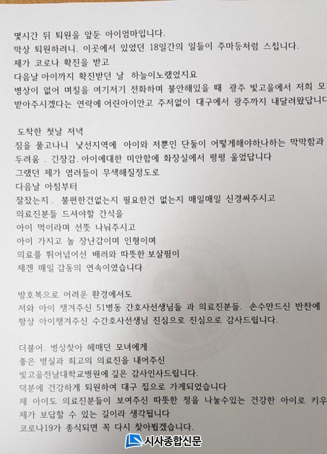 Äڷγª19 È®ÁøÆÇÁ¤À» ¹Þ°í ºû°íÀ»Àü³²´ëº´¿ø¿¡¼ Ä¡·á¸¦ ¹Þ´Ù°¡ ¿ÏÄ¡µÅ Áö³ 25ÀÏ ´ë±¸·Î µ¹¾Æ°£ A¾¾´Â Åð¿ø Á÷Àü ±¤ÁÖ¿¡¼ ´À³¤ ½É°æÀ» ´ã´ãÇÏ°Ô ÀûÀº ±ÛÀ» ÀÌ º´¿ø ȨÆäÀÌÁö¿¡ ¿Ã·È´Ù.