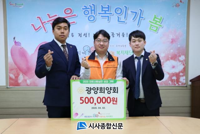 Àü´Þ½Ä¿¡ Âü¿©ÇÑ ¹Ú»ó¿í ÃÊ´ëȸÀå°ú È«¿µ¹Î ȸÀåÀº ¡°±¤¾çÈñ¾çȸ´Â ±¤¾ç½Ã °ÅÁÖÇϰí ÀÖ´Â ÀþÀº û³âµéÀÌ ¸ð¿© ¸¸µç ºÀ»ç´Üü·Î Äڷγª19·Î Èûµé¾îÇÏ´Â ±¤¾ç½Ã¹ÎÀ» À§ÇØ È¸¿øµé°ú ÇѸ¶À½ ÇѶæÀ¸·Î ¸¶·ÃÇÑ ¼º±ÝÀ» ±âŹÇÏ°Ô µÇ¾ú´Ù.¡± ¸ç ¡°¾ÕÀ¸·Îµµ ¾î·Á¿î ÀÌ¿ôÀ» À§ÇØ ³ª´®À» ½ÇõÇÒ ¼ö ÀÖµµ·Ï ³ë·ÂÇϰڴÙ.¡±°í ¸»Çß´Ù.