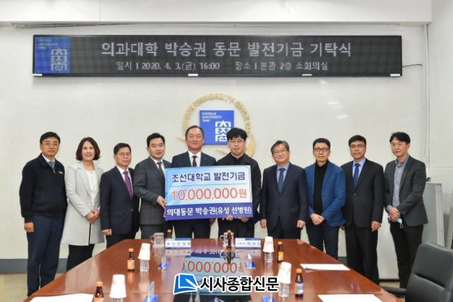 3ÀÏ Á¶¼±´ëÇб³´Â Àǰú´ëÇÐ µ¿¹®ÀÎ ¹Ú½Â±Ç(36) À¯¼º ¼±º´¿ø Á÷¾÷ȯ°æÀÇÇм¾ÅÍ Áø·á°úÀåÀ¸·ÎºÎÅÍ ¹ßÀü±â±Ý 1000¸¸¿øÀ» ±âŹ ¹Þ¾Ò´Ù. ±âʽÄÀº À̳¯ ¿ÀÈÄ 4½Ã Á¶¼±´ëÇб³ º»°ü ¼ÒȸÀǽǿ¡¼ °³ÃֵƴÙ.