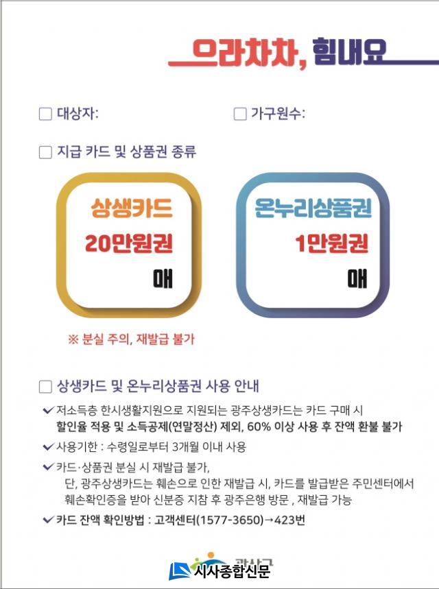 Áö¿ª»óǰ±ÇÀ» Áö¿øÇÏ´Â ÇüÅ·ΠÀü±¹¿¡¼ ÁøÇàµÇ´Â À̹ø »ç¾÷Àº, ±¤ÁÖ±¤¿ª½Ã¿¡¼´Â ±¤ÁÖ»ó»ýÄ«µå¿Í ¿Â´©¸®»óǰ±ÇÀ» ¼¯¾î ³ª´²ÁØ´Ù. º»°ÝÀûÀÎ Áö¿ø¿¡ ¾Õ¼ ±¤»ê±¸´Â, Áö¿ø´ë»óÀÎ ±âÃʼö±ÞÀÚ¿Í Â÷»óÀ§°èÃþ 12,409°¡±¸ ¼±º°À» ¸¶ÃÆ´Ù.
