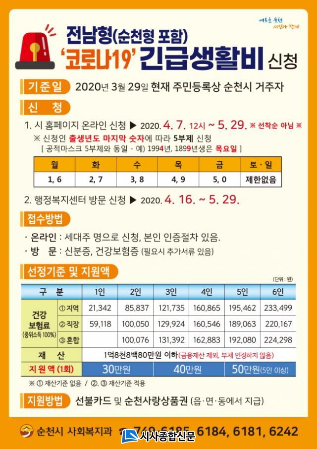 Áö¿ø ±Ù°Å´Â Àü¶ó³²µµ¿Í ¼øÃµ½Ã Àú¼ÒµæÁֹλýȰ¾ÈÁ¤Áö¿øÁ¶·Ê·Î ±âÁØÀÏÀº 3¿ù 29ÀÏ ÇöÀç Áֹεî·Ï»ó ¼øÃµ½Ã °ÅÁÖÀÚ´Ù. Áö¿ø¾×Àº 1~2ÀÎ °¡±¸ 30¸¸¿ø, 3~4ÀÎ °¡±¸ 40¸¸¿ø, 5ÀÎ ÀÌ»ó °¡±¸´Â 50¸¸¿øÀ̸ç, ¼±ºÒÄ«µå ¹× ¼øÃµ»ç¶û»óǰ±ÇÀ¸·Î 1ȸ Áö¿øÇÑ´Ù.