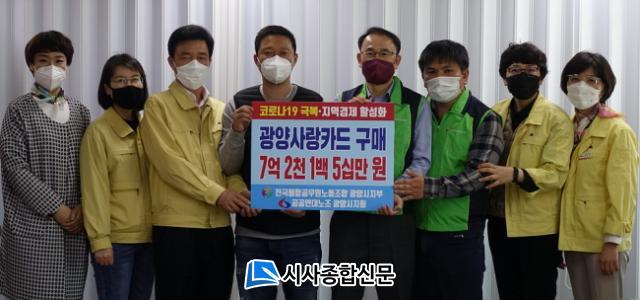 [½Ã»çÁ¾ÇսŹ® = Àå¹Î±Ô ±âÀÚ] Àü±¹ÅëÇÕ°ø¹«¿ø³ëµ¿Á¶ÇÕ ±¤¾ç½ÃÁöºÎ¿Í °ø°ø¿¬´ë³ëÁ¶ ±¤¾ç½ÃÁöȸ´Â 7¾ï2õ1¹é5½Ê¸¸ ¿ø »ó´çÀÇ ±¤¾ç»ç¶û»óǰ±ÇÄ«µå¸¦ Á¶ÇÕ¿øµéÀÌ ±¸¸ÅÇÏ¿© Äڷγª19 Á¶±â ±Øº¹°ú ħüµÈ Áö¿ª °æÁ¦ Ȱ¼ºÈ¿¡ ÈûÀ» º¸ÅÄ´Ù°í 22ÀÏ ¹àÇû´Ù.