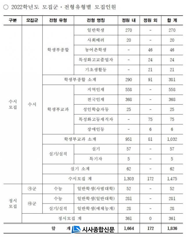 | ¼øÃµ´ëÇб³, 2022Çг⵵ ´ëÇÐÀÔÇÐÀüÇü ½ÃÇà°èȹ ¹ßÇ¥ ¼ö½Ã 1,475¸í, Á¤½Ã 361¸í µî ÃÑ 1,836¸í ¸ðÁý