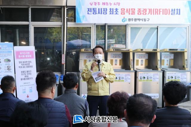 µ¿±¸´Â ÃÖ±Ù Àü±¹¿¡¼ óÀ½À¸·Î ³²±¤ÁÖÇØ¶ß´Â½ÃÀå¿¡ À½½Ä¹°Ã³¸®Á¾·®±â¸¦ ¼³Ä¡Çß´Ù. À½½Ä¹°Ã³¸®Á¾·®±â´Â ¹«¼±Á֯ļö¸¦ ÀÌ¿ëÇØ ´ë»óÀ» ½Äº°ÇÏ´Â ÀåÄ¡·Î ¹èÃâÄ«µå¸¦ ÀνÄÇØ »ç¿ëÀÚÁ¤º¸¸¦ È®ÀÎÇϰí À½½Ä¹° ¾²·¹±â¹«°Ô¸¦ °è»ê, ¹èÃâÇÑ ¸¸Å ¼ö¼ö·á¸¦ ºÎ°úÇÏ´Â ¹æ½ÄÀÌ´Ù.