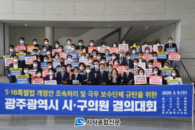 ±¤ÁÖ½ÃÀÇȸ¿Í 5°³ ÀÚÄ¡±¸ ¼Ò¼ÓÀÇ¿ø 90¿©¸íÀº 6ÀÏ ¿ÀÀü ±¤ÁÖ½Ãû 1Ãþ ½Ã¹ÎȦ¿¡¼ ½Ã‧ÀÚÄ¡±¸ÀÇȸ ÇÕµ¿ °áÀÇ´ëȸ¸¦ °³ÃÖÇÏ¿© ±Ø¿ìº¸¼ö´ÜüÀÇ ±Ý³²·Î Áýȸ ÃßÁøÀ» ±ÔźÇϰí 5‧18À» ¿Ö°î‧³¯Á¶ÇÏ´Â ÇàÀ§¸¦ ±ÝÁöÇÏ´Â 5‧18Ưº°¹ýÀÇ Á¶¼ÓÇÑ Ã³¸®¸¦ Ã˱¸ÇÏ´Â ¼º¸íÀ» ¹ßÇ¥Çß´Ù.