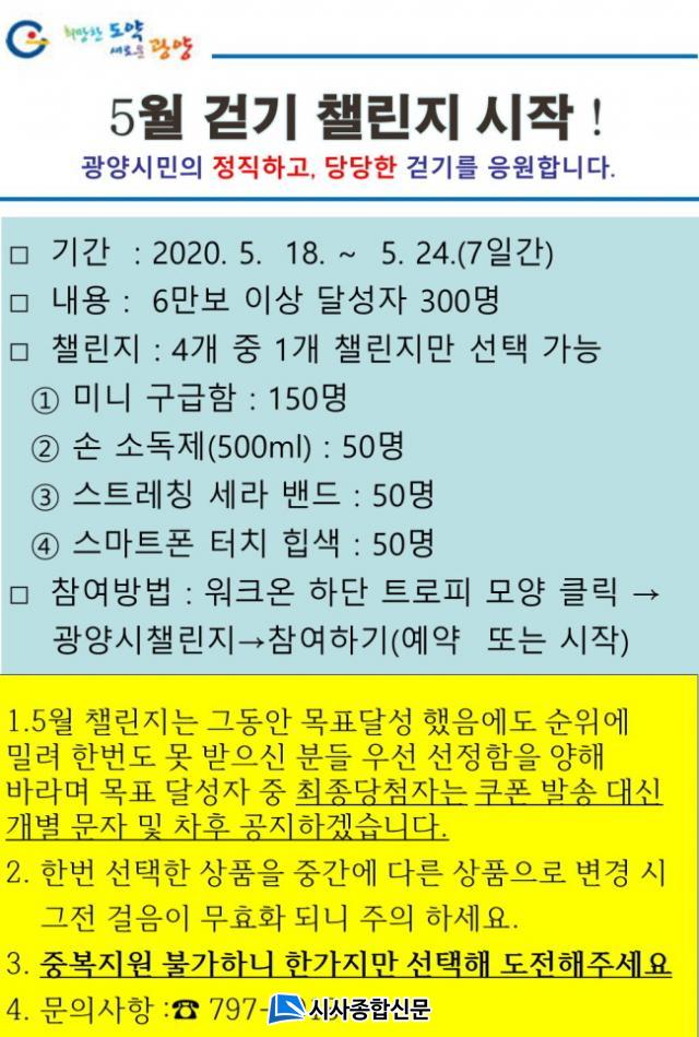 ¸ñÇ¥ ´Þ¼º ÈÄ °È±â ½Çõ »çÁø(2ÀÎ ÀÌ»ó)°ú ±àÁ¤Àû º¯È¸¦ ¿ä¾àÇØ¼ 5¿ù 30ÀϺÎÅÍ 6¿ù 1ÀϱîÁö ¿öÅ©¿Â Ä¿¹Â´ÏƼ °Ô½ÃÆÇ¿¡ ¿Ã¸®´Â ¹Ì¼ÇÀ» ¼öÇàÇÑ ÆÀ Áß 10ÆÀ ¼±Á¤ÇÏ¿© ±¤¾ç»ç¶û»óǰ±Ç 5¸¸ ¿øÀ» ÆÀº°·Î Áö±ÞÇÒ °èȹÀÌ´Ù.