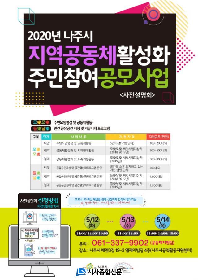 ÇÑÆí, Áö¿ª°øµ¿Ã¼È°¼ºÈ ÁÖ¹ÎÂü¿©°ø¸ð»ç¾÷ »çÀü¼³¸íȸ µî¿¡ ´ëÇÑ ¹®ÀÇ ¹× ¾È³»»çÇ×Àº ³ªÁֽðøÀÍȰµ¿Áö¿ø¼¾ÅÍ, ³ªÁÖ½Ãû ´©¸®Áý °øÁö»çÇ×, ³ªÁֽðøÀÍȰµ¿Áö¿ø¼¾ÅÍ ºí·Î±×¸¦ ÅëÇØ ÇÏ¸é µÈ´Ù.