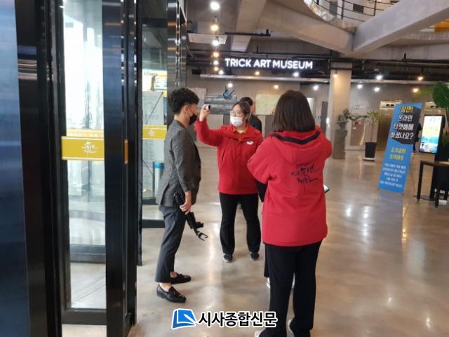 ½Ç³» °ü±¤½Ã¼³µµ ü¿Â°è¸¦ ºñÄ¡Çϰí ÀÔÀå ½Ã ¹ß¿ È®Àΰú ¸¶½ºÅ© Âø¿ëÀ» ¾È³»Çß´Ù.