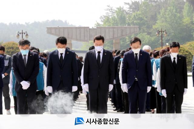 À̳¯ ÇÕµ¿Âü¹è´Â À̿뼷 ½ÃÀå°ú ±èµ¿Âù ±¤ÁÖ½ÃÀÇȸ ÀÇÀå, ½Ã °£ºÎ, ½ÃÀÇȸ ÀÇ¿ø, °ø»ç¡¤°ø´Ü ¹× ÃâÀÚ¡¤Ã⿬±â°üÀå, 5¡¤18±â³äÀç´Ü ÀÌ»çÀå, 5¡¤18´Üü(À¯Á·È¸¡¤ºÎ»óÀÚȸ¡¤±¸¼ÓºÎ»óÀÚȸ) µî 80¿©¸íÀÌ Âü¿©Çß´Ù.