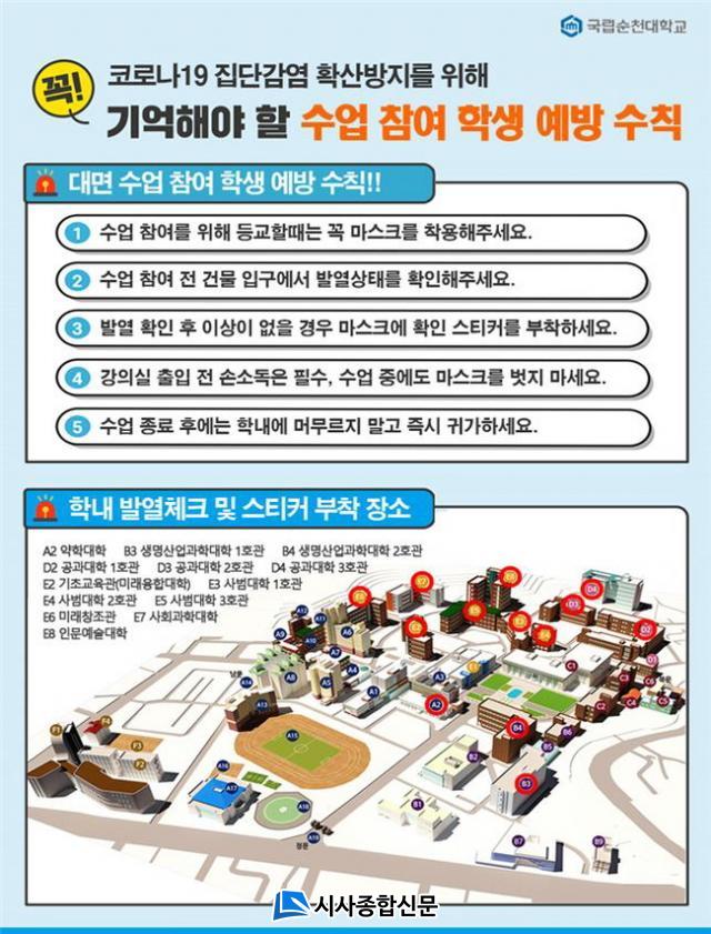 ¼øÃµ´ëÇб³ Çлýó ÇлýÁö¿ø°ú´Â ´ë¸é ¼ö¾÷¿¡ Âü¿©ÇÏ´Â ¸ðµç Çлý¿¡°Ô µî±³ Àü ÀÚ°¡Áø´Ü ¼³¹®¿¡ ÀÀ´äÇϵµ·Ï ÇÏ¿© ¼³¹® ¹®Ç×(¹ß¿, ÀÇ½É Áõ»ó ¿©ºÎ) Áß Çϳª¶óµµ ÇØ´ç µÉ °æ¿ì ¼ö¾÷¿¡ Âü¿© ÇÒ ¼ö ¾ø°Ô Çϰí, µî±³ ÈÄ¿¡´Â ¼ö¾÷°ü°èÀÚ¸¦ ´ë»óÀ¸·Î ¸¶½ºÅ© Âø¿ë ¿©ºÎ ¹× ¹ß¿ Áõ»ó È®ÀÎ ½ºÆ¼Ä¿¸¦ ¹ßºÎÇϸç, ´ã´ç ±³¼ö ¹× ºÎ¼ °ü°èÀÚ¸¦ ÅëÇØ ¼ö½Ã·Î ºÎÂø À¯¹«¸¦ È®ÀÎÇÒ ¿¹Á¤ÀÌ´Ù.