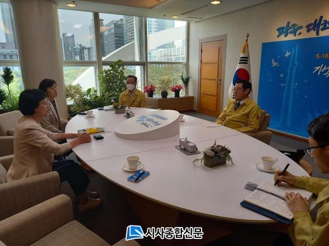 5¿ù 14ÀÏ ¸ñ¿äÀÏ ¿ÀÀü 11½Ã ½ÃÀå½Ç¿¡¼ ¸¸³ µÎ »ç¶÷Àº ±¤ÁÖÇü ÀÏÀÚ¸®¿Í Äڷγª19·Î ¾î·Á ¿öÁø Áö¿ª»óȲ µî¿¡ ´ëÇÑ ÀÌÇØ¸¦ °°ÀÌ Çϰí ÀÌÈÄ Àû±ØÀûÀÎ Çù·ÂÀ» ÇØ °¡±â·Î ÇÏ¿´´Ù.