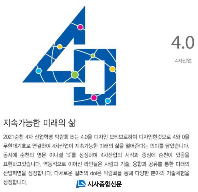 ¿¬°áµÈ 4¿Í 0Àº 4Â÷»ê¾÷Çõ¸í°ú µ¿½Ã¿¡ ¼øÃµÀÇ ¿µ¹® À̴ϼÈÀÎ ¡®S¡¯¸¦ »ó¡Çϸç, 4Â÷»ê¾÷Çõ¸íÀÇ Á߽ɿ¡ ¼øÃµÀÌ ÀÖÀ½À» Ç¥ÇöÇß´Ù. ¿ªµ¿ÀûÀ¸·Î À̾îÁø ¼±Àº »ç¶÷°ú ±â¼ú, À¶ÇÕ°ú °øÀ¯ÀÇ ¹Ì·¡¸¦ »ó¡Çϰí, ´Ùä·Î¿î »ö»óÀÇ Á¡µéÀº ¹Ú¶÷ȸ¿¡¼ ´Ù¾çÇÑ ºÐ¾ßÀÇ ±â¼ú°ú üÇèÀ» ÆîÃÄÁú °ÍÀ» Ç¥ÇöÇÑ °ÍÀÌ´Ù.