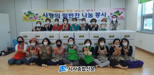 Äڷγª19 »ýȰ ¼Ó °Å¸®µÎ±â ÀÌÇà°ú °ü·Ã, 40¿©¸íÀÇ ¿©¼º´Üüȸ¿øµéÀÌ ½Å¼±ÇÑ Àç·á¸¦ ÁغñÇØ Á÷Á¢ ¸¸µç ¹ÝÂù 5Á¾·ù¸¦ Áøµµ±º °ü³» Àú¼Òµæ ÇѺθð°¡Á· 100°¡±¸¿¡ Àü´ÞÇß´Ù.