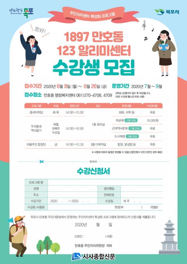 ¸¸È£µ¿ ÁÖ¹ÎÀÚÄ¡À§¿øÈ¸(À§¿øÀå ¼Àå±Ç)°¡ ÁÖ°üÇϰí Àü¶ó³²µµÁÖ¹ÎÀÚÄ¡¼¾ÅÍ Æ¯¼ºÈ °ø¸ð»ç¾÷À¸·Î °³ÃֵǴ ¡®1897 ¸¸È£µ¿ 123 ¾Ë¸®¹Ì¼¾ÅÍ¡¯´Â 7¿ù ºÎÅÍ 9¿ù ±îÁö µ¿ÇàÁ¤º¹Áö¼¾ÅÍ(1Ãþ ȸÀǽÇ, 3Ãþ ´Ù¸ñÀû½Ç)¿¡¼ ÁøÇàµÈ´Ù.