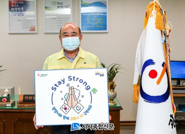 ¼Ûµµ±Ù »çõ½ÃÀåÀÇ Áö¸íÀ» ¹ÞÀº Á¤Çöº¹ ±¤¾ç½ÃÀåÀº ¡®±¤¾ç½Ã¿Í ÇÔ²² Äڷγª19 ±Øº¹Çؿ䡯¶ó´Â ¹®±¸°¡ ÀûÈù ¼ÕÆÖ¸»À» µé°í Ä·ÆäÀο¡ µ¿ÂüÇß´Ù.