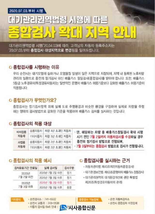 ÀÚµ¿Â÷Á¾ÇÕ°Ë»ç ´ë»óÀº ¼øÃµ½Ã¿¡ µî·ÏµÈ ÀÚµ¿Â÷ Áß °Ë»ç À¯È¿±â°£ ¸¸·áÀÏÀÌ ¿ÃÇØ 7¿ù 3ÀÏ ÀÌÈÄÀÎ ¸ðµç ÀÚµ¿Â÷°¡ ÇØ´çµÇ¸ç, Á¾ÇÕ°Ë»ç ´ë»óÂ÷·®À̶ó ÇÒÁö¶óµµ ¿À´Â 7¿ù 2ÀÏ ÀÌÀü±îÁö´Â Á¤±â°Ë»ç·Î ¼ö°ËÀÌ °¡´ÉÇÏ´Ù. ´Ù¸¸ Àü±âÂ÷, ¼ö¼ÒÂ÷ µî Àú°øÇØÀÚµ¿Â÷´Â ÀÚµ¿Â÷Á¾ÇÕ°Ë»ç ´ë»ó¿¡¼ Á¦¿ÜµÈ´Ù.