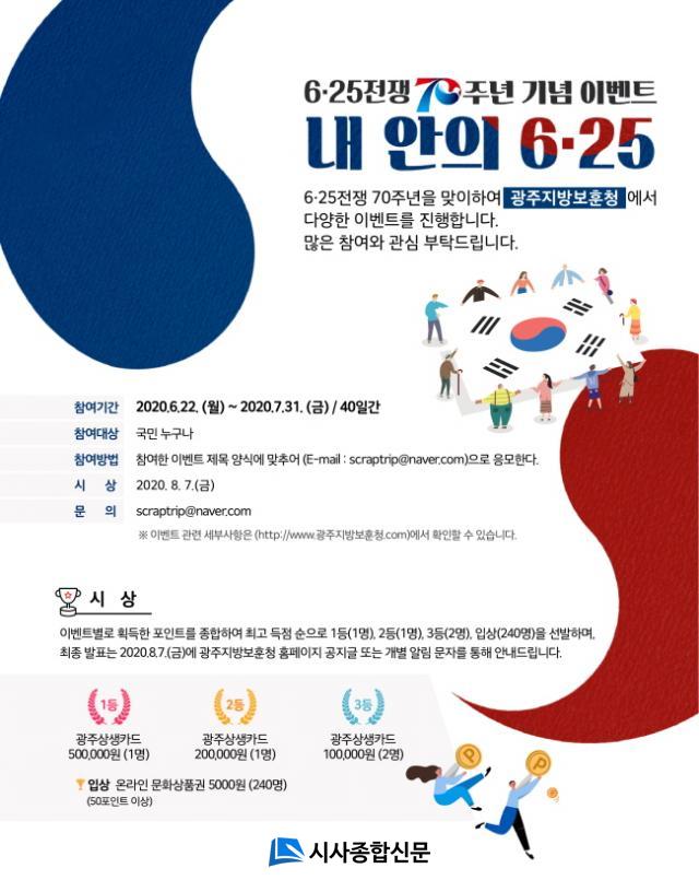 À̹ø <³» ¾ÈÀÇ 6¡¤25> À̺¥Æ®´Â 6¡¤25ÀüÀïÀ» Å׸¶·Î ÇÑ 6°³ÀÇ À̺¥Æ®¸¦ µ¿½Ã¿¡ ÁøÇàÇÏ´Â ÅëÇÕÇü ¿Â¶óÀÎ Çà»ç·Î ÁøÇàµÇ¸ç, 1µîºÎÅÍ 3µî¿¡°Ô´Â ±¤ÁÖ »ó»ýÄ«µå °¢°¢ 50¸¸¿ø, 20¸¸¿ø, 10¸¸¿øÀ» Áö±ÞÇÏ´Â µî ¿ì¼ö ÀÀ¸ðÀÚ¸¦ ´ë»óÀ¸·Î ÃÑ 210¸¸¿ø »ó´çÀÇ »ó±ÝÀ» Áö±ÞÇÒ ¿¹Á¤ÀÌ´Ù.