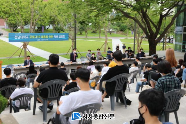 Á¤º´¼® Àü³²´ëÃÑÀåÀº Áö³ 7¿ù 1ÀÏ ¿ÀÈÄ 5½Ã Çг» Áß¾Óµµ¼°ü ¾Õ °è´Ü¿¡¼ ½ÅÀÔ»ý°ú ÀçÇлý, °¢ Çаú(ºÎ) ´ëÇ¥, ÇлýÁ߾ӿÀ§¿øÈ¸, Ãѵ¿¾Æ¸®¿¬ÇÕȸ µî 80¿©¸íÀÇ ÇлýµéÀÌ Âü¼®ÇÑ °¡¿îµ¥ ¡®Äڷγª19 ´ëÀÀÀ» À§ÇÑ Çлý ¼³¸íȸ¡¯¸¦ °®°í, ¹æ¿ª, Çлç, ÀçÁ¤ µî Çб³ ÇöȲ¿¡ ´ëÇÑ ¼³¸í°ú ÁúÀÇÀÀ´ä½Ã°£À» °¡Á³´Ù.