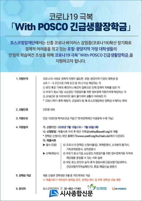 ¡¸With POSCO ±ä±Þ»ýȰÀåÇбݡ¹ ¼±¹ß´ë»óÀº ¿ÃÇØ ±âÁØÁßÀ§¼Òµæ 60% ÀÌÇÏÀÎ Æ÷Çס¤±¤¾çÁö¿ª °¡Á¤ÀÇ ´ëÇлýÀ¸·Î, Äڷγª19 »çÅ·ΠÀÎÇØ ºÎ¸ð°¡ ½ÇÁ÷À̳ª Æó¾÷À» ´çÇØ °¡Á¤°æÁ¦°¡ ±Þ°ÝÈ÷ ¾î·Á¿öÁ³°Å³ª ¾Æ¸£¹ÙÀÌÆ® ÀÏÀÚ¸®¸¦ ÀÒ¾î »ýȰÀÌ ¾î·Á¿öÁø ÇлýÀÌ´Ù. ¼±¹ßÀοøÀº 200¸í ±Ô¸ðÀÌ¸ç ±Ý¹ø ¼±¹ßµÈ ÇлýµéÀº Àδç 100¸¸¿øÀÇ Çкñº¸Á¶±ÝÀ» 8¿ù Áß Áö±Þ¹Þ°Ô µÈ´Ù.