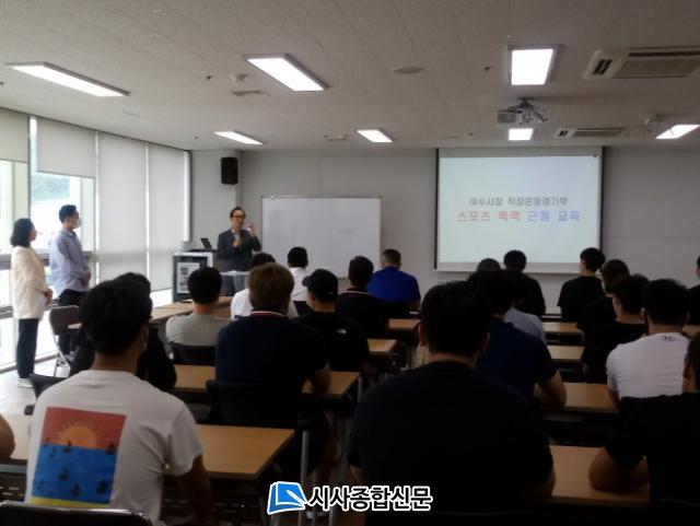 ·ù¼º½Ä üÀ°Áö¿ø°úÀå°ú ½ºÆ÷Ã÷¸¶ÄÉÆÃÆÀÀåÀ» ºñ·ÔÇØ ¿©¼ö½Ãû Á÷Àå¿îµ¿°æ±âºÎ ÁöµµÀÚ¡¤¼±¼ö µî 33¸íÀÌ Âü¼®Çß´Ù. À̳¯ ±³À°À» ÅëÇØ ½ºÆ÷Ã÷Æø·Â ¿¹¹æ µ¿¿µ»ó ½Ãû°ú ½ºÆ÷Ã÷Æø·Â ¹ß»ý ½Ã ´ëó ¹æ¾È µî ó¸® ¸Å´º¾ó¿¡ ´ëÇØ ¼³¸íÇß´Ù. ƯÈ÷ ½ºÆ÷Ã÷(¼º)Æø·Â ¡°è¿¡ ´ëÇØ °Á¶ÇÔÀ¸·Î½á ÁöµµÀÚ ¹× ¼±¼öµé¿¡°Ô ´Ù½Ã ÇÑ ¹ø °æ°¢½ÉÀ» Àϱú¿ü´Ù.