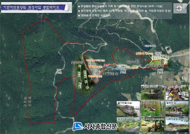 ±âÂù ÀÚ¿¬È޾縲Àº ±â Á¶¼ºµÈ »ê¸²¿åÀå, »ýŽ£ ¹× »ç¹æ´ï µî°ú ¿¬°èÇØ 46haÀÇ »ê¸²¿¡ 70¿©¾ï¿øÀ» ÅõÀÔÇÏ¿© Á¶¼ºÇÒ ÀÚ¿¬È޾縲À¸·Î ÈÞ¾çÈ¿°ú¸¦ ±Ø´ëÈÇϰí, Å©°Ô 2°¡Áö Å׸¶·Î ±¸ºÐµÈ °ø°£À¸·Î Á¶¼ºÇÒ °èȹÀÌ´Ù.