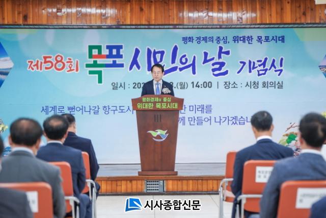 ¿ÃÇØ·Î 58ȸ°¸¦ ¸ÂÀÌÇÏ´Â ¸ñÆ÷ ½Ã¹ÎÀÇ ³¯ ±â³ä½ÄÀº ±èÁ¾½Ä ½ÃÀå, ½ÃÀÇÀå ¹× µµÀÇ¿ø, ±â°ü´ÜüÀå ¹× °¢°è°¢Ãþ ÀÎ»ç µî 40¿©¸íÀÌ Âü¼®ÇÑ °¡¿îµ¥ ¼Ò±Ô¸ðÀÌÁö¸¸ ½Ã¹ÎÀÇ ÈÇÕÇÏ´Â ¸¶À½À» ´ã¾Æ ³»½ÇÀÖ°Ô ÁøÇàµÆ´Ù.