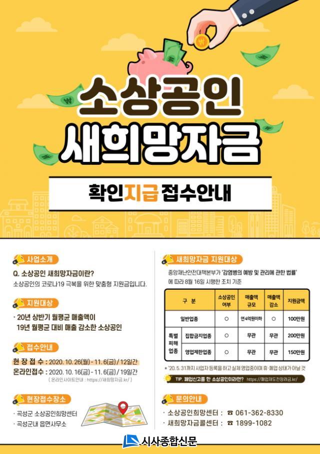 ¼Ò»ó°øÀÎ »õÈñ¸ÁÀÚ±ÝÀº Äڷγª19·Î ¸ÅÃâÀÌ °¨¼ÒÇϰųª ÁýÇÕ±ÝÁö ¶Ç´Â ¿µ¾÷Á¦ÇÑ µîÀÇ ¸í·ÉÀ» ¹ÞÀº ¼Ò»ó°øÀο¡°Ô Á¤ºÎ¿¡¼ Áö¿øÇÏ´Â 2Â÷ Àç³Áö¿ø±ÝÀ¸·Î Á¤ºÎ°¡ ÇàÁ¤Á¤º¸¸¦ º¸À¯ÇÑ ¼Ò»ó°øÀο¡ ´ëÇØ¼´Â Ãß¼®Àü ¹®Àڹ߼ÛÀ» ÅëÇØ »õÈñ¸ÁÀÚ±Ý ½Å¼ÓÁö±ÞÀ» ¾È³»Çϰí 9. 24.(¸ñ)ºÎÅÍ ¿Â¶óÀÎ Á¢¼ö¸¦ ½ÃÀÛÇÑ ¹Ù ÀÖ´Ù.