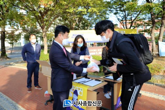 Àü³²´ë´Â ÇлýÁß¾ÓÀ§¿øÈ¸¿Í ÇÔ²² 10¿ù 19ÀÏ Áß°£°í»ç ½ÃÇèÀ» Ä¡¸£±â À§ÇØ ¾ÆÄ§À» °Å¸¥ ä µî±³ÇÏ´Â ÇлýµéÀ» À§ÇØ Àü³²´ë ÈĹ®°ú Áß¾Óµµ¼°ü º°°ü(¹éµµ) ¾Õ¿¡¼ ±è¹ä°ú À½·á µîÀ» Æ÷ÀåÇÑ µµ½Ã¶ô ÁָӴϸ¦ ¹èºÎÇϰí À̵éÀ» °Ý·ÁÇß´Ù. µµ½Ã¶ôÀº À̳¯ºÎÅÍ ÇÏ·ç 500°³¾¿ 10Àϵ¿¾È ¸ðµÎ 5,000°³¸¦ ³ª´²ÁØ´Ù.