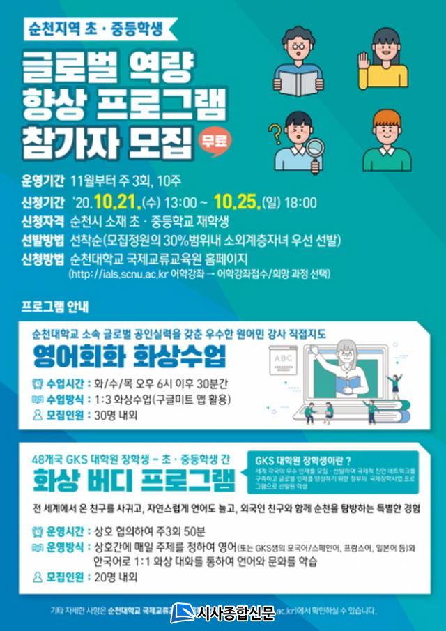 À̹ø ±Û·Î¹ú ¿ª·® Çâ»ó ÇÁ·Î±×·¥Àº ¿ø¾î¹Î °»ç°¡ ¿î¿µÇÏ´Â ¡®¿µ¾îÈ¸È È»ó¼ö¾÷(1:3)¡¯°ú GKS ÀåÇлý°ú ÇÔ²²ÇÏ´Â ¡®È»ó ¹öµð ÇÁ·Î±×·¥(1:1)¡¯À¸·Î ±¸¼ºµÇ¾úÀ¸¸ç, ¼øÃµ½Ã¿¡ °ÅÁÖÇÏ´Â ÃÊ¡¤Áßµî Çлý 50¿© ¸í(Ȼ󿵾î 30¸í, ¹öµð ÇÁ·Î±×·¥ 20¸í)À» ´ë»óÀ¸·Î ¿î¿µÇÑ´Ù.