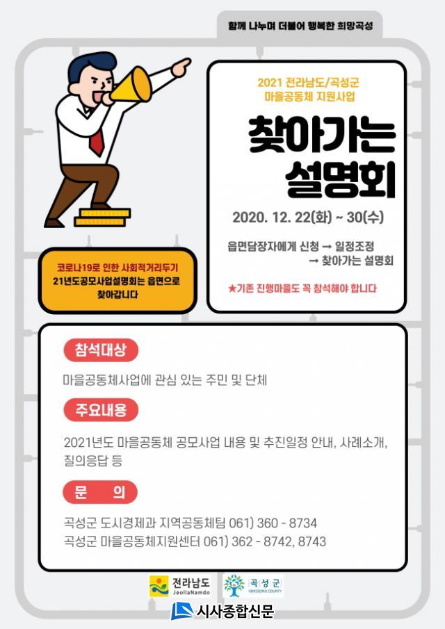 ±Ý¹ø ¼³¸íȸ´Â 12. 22.(È) 13½Ã ¸ñ»çµ¿¸éÀ» ½ÃÀÛÀ¸·Î 12. 29.(È)±îÁö °¢ À¾¸éº°·Î ÁøÇàµÇ¸ç, Äڷγª19 È®»ê¹æÁö¸¦ À§ÇÏ¿© °î¼º±º ¸¶À»°øµ¿Ã¼Áö¿ø¼¾ÅͰ¡ À¾․¸é»ç¹«¼Ò¿¡ Á÷Á¢ ã¾Æ°¡ ÁøÇàÇÑ´Ù.