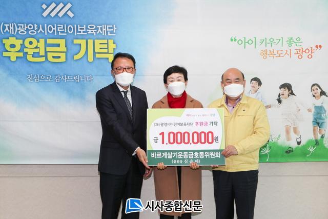 ±¤¾ç½Ã ±ÝÈ£µ¿Àº 12¿ù 30ÀÏ 11½Ã ½Ãû Á¢°ß½Ç¿¡¼ ¹Ù¸£°Ô»ì±â¿îµ¿ ±ÝÈ£µ¿À§¿øÈ¸(½É¼ø¾Ö À§¿øÀå)°¡ (Àç)±¤¾ç½Ã¾î¸°À̺¸À°Àç´Ü¿¡ 100¸¸ ¿øÀ» ±âŹÇϰí, Áö³ 23ÀÏ¿¡ ±ÝÈ£µ¿ ÁÖ¹ÎÀÚÄ¡À§¿øÈ¸(À§¿øÀå ±èÀ±Ç¥)¿¡¼ (Àç)±¤¾ç½Ã»ç¶û³ª´®º¹ÁöÀç´Ü¿¡ ¼º±Ý 162¸¸ ¿øÀ» Àü´ÞÇß´Ù°í ¹àÇû´Ù.