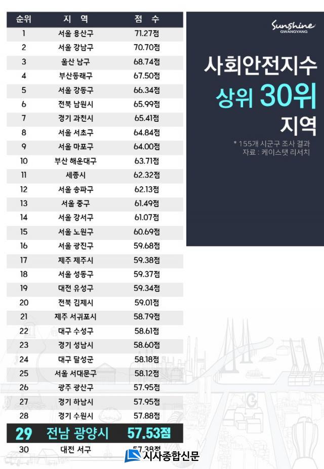 ±âÃÊÁöÀÚü Áß Ç¥º»ÀÇ ¼ýÀÚ°¡ ÀûÀº °÷À» Á¦¿ÜÇÑ Àü±¹ 155°³ ÁöÀÚü¿¡¼ ±¤¾ç½Ã´Â 29À§·Î Àü³²¿¡¼ À¯ÀÏÇÏ°Ô »óÀ§ 30À§±Ç¿¡ Æ÷ÇԵǾúÀ¸¸ç, Ưº°½Ã¡¤±¤¿ª½Ã ¼ÒÀçÁö¸¦ Á¦¿ÜÇÑ ½Ã.±º.±¸ Áß¿¡´Â 10À§¿¡ À̸§À» ¿Ã·È´Ù.