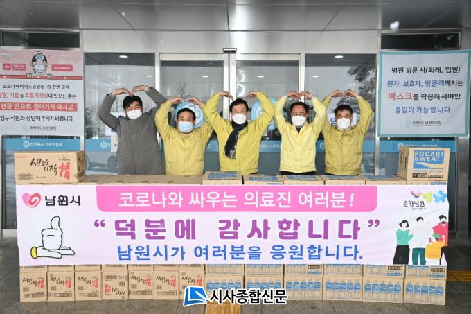 [½Ã»çÁ¾ÇսŹ® = ³²Àç¿Á ±âÀÚ] ÀÌȯÁÖ ³²¿ø½ÃÀåÀÌ ¡®Äڷγª Àü´ãº´¿ø¡¯À¸·Î ÁöÁ¤µÈ Àü¶óºÏµµ ³²¿øÀÇ·á¿øÀ» 18ÀÏ(¿ù) ¹æ¹®ÇØ Äڷγª19 °¨¿°º´ ȯÀÚ Ä¡·á¸¦ À§ÇØ Èû¾²°í ÀÖ´Â ÀÇ·áÁøµé¿¡°Ô °Ý·Áǰ(°úÀÚ·ù, À½·á µî)À» Àü´ÞÇϰí, °¨»çÀÇ ¸¶À½À» ÀüÇß´Ù.