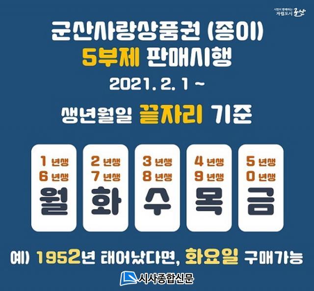 ±º»ê½Ã´Â ¿À´Â 2¿ù 1ÀϺÎÅÍ Ãâ»ý³âµµ¿¡ µû¶ó ¿äÀϺ°·Î ±º»ê»ç¶û»óǰ±Ç(Á¾ÀÌ)À» ±¸¸ÅÇÒ ¼ö ÀÖ´Â ¡º±º»ê»ç¶û»óǰ±Ç 5ºÎÁ¦¡»¸¦ ½ÃÇàÇÑ´Ù°í 19ÀÏ ¹àÇû´Ù.