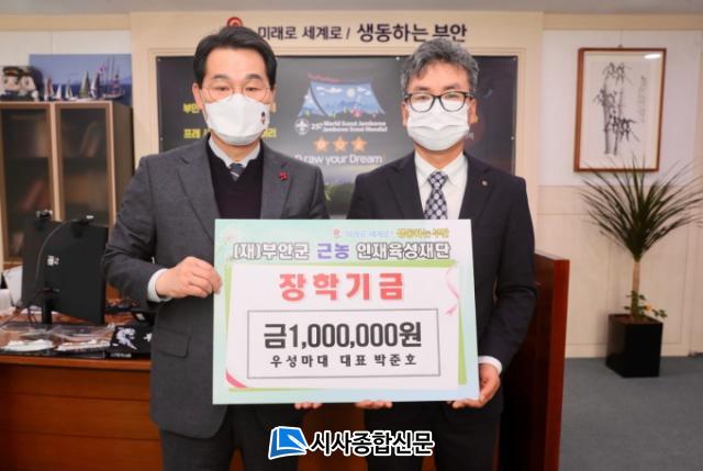 | ¿ì¼º¸¶´ë ¹ÚÁØÈ£ ´ëÇ¥, ºÎ¾È ±Ù³óÀÎÀçÀ°¼ºÀåÇÐ±Ý 100¸¸¿ø ±âŹ |