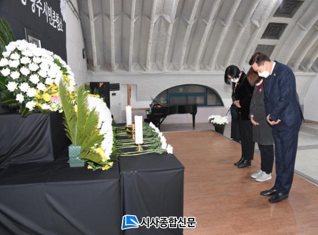[½Ã»çÁ¾ÇսŹ® = ¿À½ÂÅà ±âÀÚ] ±¤ÁÖ±¤¿ª½ÃÀÇȸ ±è¿ëÁý ÀÇÀå°ú ±è±¤¶õ, ÃÖ¹ÌÁ¤ ÀÇ¿øÀº 17ÀÏ µ¿±¸YMCA ¹«Áø°ü¿¡ ¸¶·ÃµÈ °í(ͺ) ¹é±â¿Ï ÅëÀϹ®Á¦¿¬±¸¼ÒÀåÀÇ ½Ã¹ÎºÐÇâ¼Ò¸¦ ã¾Æ Á¶¹®ÇÏ°í °íÀÎÀÇ ¸íº¹À» ºô¾ú´Ù.