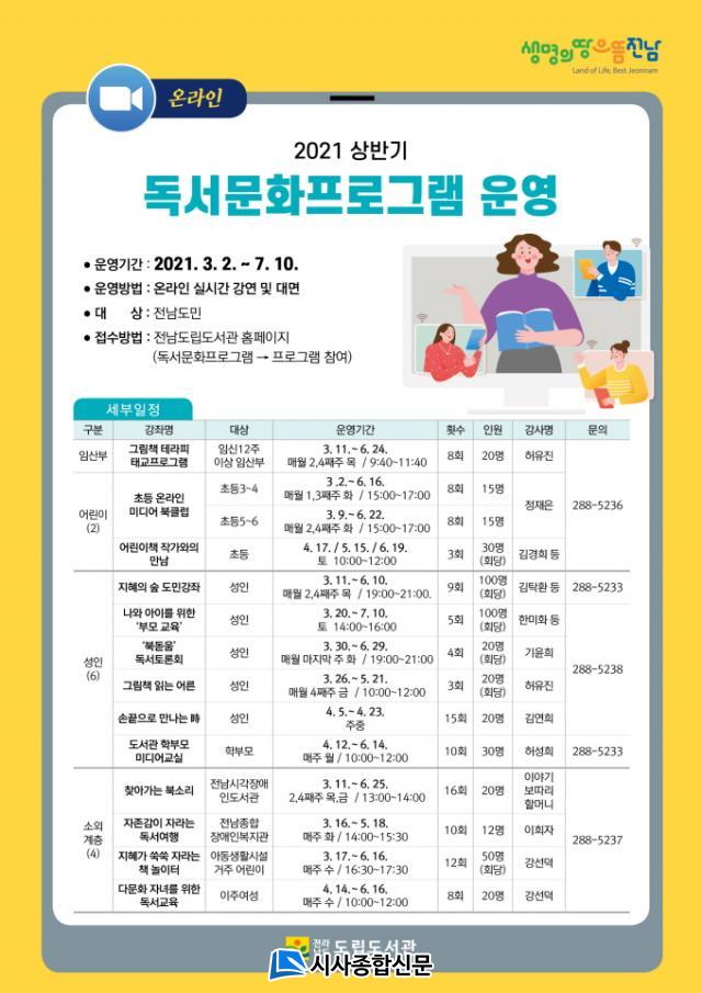 °¢ ÇÁ·Î±×·¥ÀÇ ÀÚ¼¼ÇÑ ³»¿ëÀº Àü³²µµ¸³µµ¼°ü ´©¸®Áý(lib.jeonnam.go.kr)À̳ª ÀüÈ(061-288-5233)·Î ¹®ÀÇÇÏ¸é µÈ´Ù.