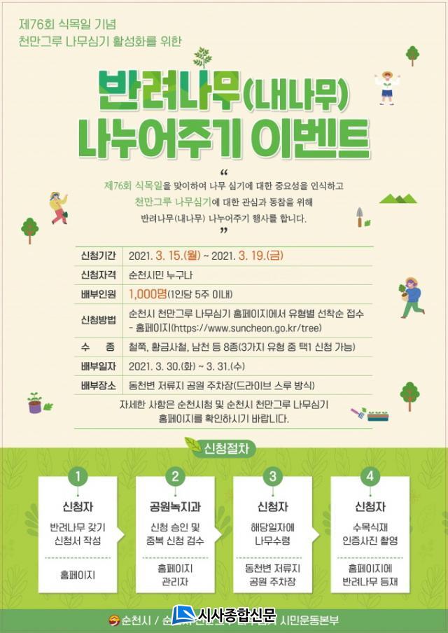¼øÃµ½Ã´Â ¹Ý·Á³ª¹«(³» ³ª¹«)¸¦ ½É°í °¡²Ù´Â ºÐÀ§±â¸¦ Á¶¼ºÇÏ¿© ³ª¹«½É±â¿¡ °ü½É°ú Âü¿©¸¦ À¯µµÇϰí, ¹Ý·Á³ª¹« °®±â È®»êÀ» À§ÇØ ¹Ý·Á³ª¹« ³ª´©¾î ÁÖ±â À̺¥Æ®¸¦ 3¿ù 15ÀϺÎÅÍ 19ÀϱîÁö ¼øÃµ½Ã õ¸¸±×·ç ³ª¹«½É±â ȨÆäÀÌÁö(www.suncheon.go.kr/tree)¿¡¼ ¼±Âø¼øÀ¸·Î ½ÅûÀ» ¹Þ´Â´Ù.