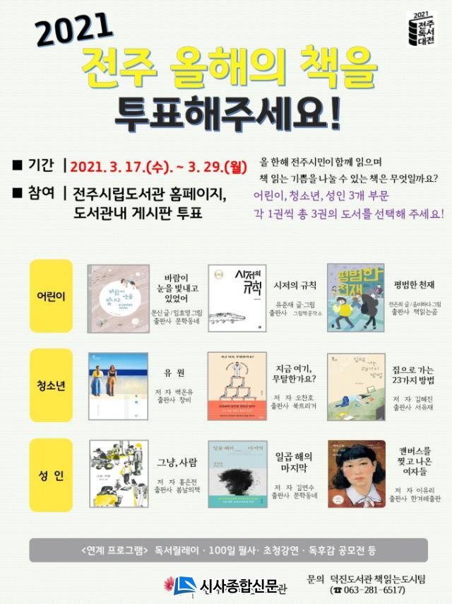 ÀüÁֽô ¿À´Â 29ÀϱîÁö ÀüÁֽø³µµ¼°ü ȨÆäÀÌÁö(lib.jeonju.go.kr)¿Í 9°³ ÀüÁֽà µµ¼°üÀ» ÅëÇØ ¾î¸°ÀÌ¡¤Ã»¼Ò³â¡¤¼ºÀÎ µî ºÎ¹®º° ¡®2021 ÀüÁÖ ¿ÃÇØÀÇ Ã¥¡¯À» ¼±Á¤Çϱâ À§ÇÑ ½Ã¹Î ¼±È£µµÁ¶»ç¸¦ ÇÑ´Ù°í 17ÀÏ ¹àÇû´Ù.