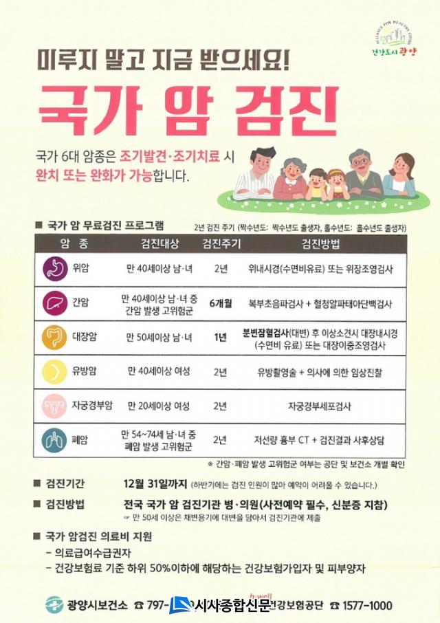 ¾ÏÁ¾º° ´ë»óÀÚ ±âÁØÀº À§¾Ï°ú À¯¹æ¾ÏÀº ¸¸ 40¼¼ ÀÌ»ó(2³â), ´ëÀå¾ÏÀº ¸¸ 50¼¼ ÀÌ»ó(1³â), ÀڱðæºÎ¾ÏÀº ¸¸ 20¼¼ ÀÌ»ó(2³â), °£¾Ï °ËÁø ´ë»óÀÚ´Â ¸¸ 40¼¼ ÀÌ»ó °£¾Ï¹ß»ý À§Ç豺À» ´ë»óÀ¸·Î 6°³¿ù¸¶´Ù °ËÁøÀ» ¹Þµµ·Ï ±Ç°íÇϰí ÀÖ´Ù.