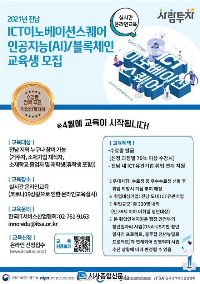 1Â÷ ±³À°Á¢¼ö´Â 4¿ù 2ÀϱîÁö Àü³² ICTÀ̳뺣À̼ǽºÄù¾î ȨÆäÀÌÁö(www.innoitsa.or.kr)¸¦ ÅëÇØ Àü³²µµ¹Î ´©±¸³ª ½ÅûÇÒ ¼ö ÀÖ´Ù. ÀÚ¼¼ÇÑ »çÇ×Àº Àü³² ICTÀ̳뺣À̼ǽºÄù¾î ±³À°¾÷ü(¢Ï02-761-9163)·Î ¹®ÀÇÇÏ¸é µÈ´Ù.